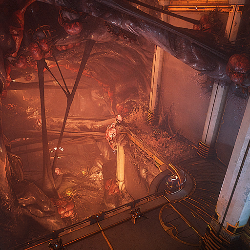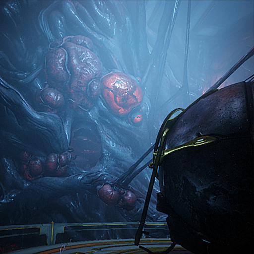 Toxin around its mouth and occasionally spits out throbbing sacs that emit an increasingly high-pitched noise before exploding. These sacs can be picked up and thrown back into the pit via Alternate Fire, spawning Infested growths on the machinery above the pit. Shooting these will cause some of the machinery to fall into the pit, after which several