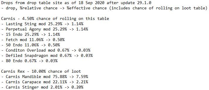 Drops from drop table site as of 18 Sep 2020 after update 29.1.0 - drop, %relative chance -> %effective chance (includes chance of rolling on loot table) Carnis - 4.50% chance of rolling on this table - Lasting Sting mod 25.29% -> 1.14% - Perpetual Agony mod 25.29% -> 1.14% - 15 Endo 25.29% -> 1.14% - Fetch mod 11.06% -> 0.50% - 50 Endo 11.06% -> 0.50% - Conditon Overload mod 0.67% -> 0.03% - Defiled Snapdragon mod 0.67% -> 0.03% - 80 Endo 0.67% -> 0.03% Carnis Rex - 10.00% chance of loot - Carnis Mandible mod 75.88% -> 7.59% - Carnis Carapace mod 22.11% -> 2.21% - Carnis Stinger mod 2.01% -> 0.20%