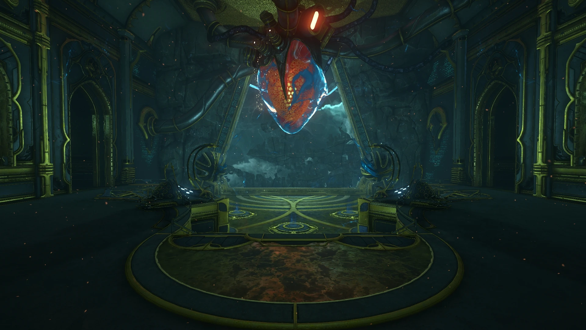 The door guarding the Heart contains a Requiem Cipher, locked by four Requiem symbols on its panel. The player is only given a brief moment to memorize the pattern before interacting with the nearby Reactive Crystals, in the order of the symbols from top to bottom, but can retry as many times as needed until the door opens. As the Tenno approaches the Heart, it releases a pulse that abruptly disables the player's Warframe. A rogue Necramech emerges from the Void door and opens fire on them before destroying the Heart.