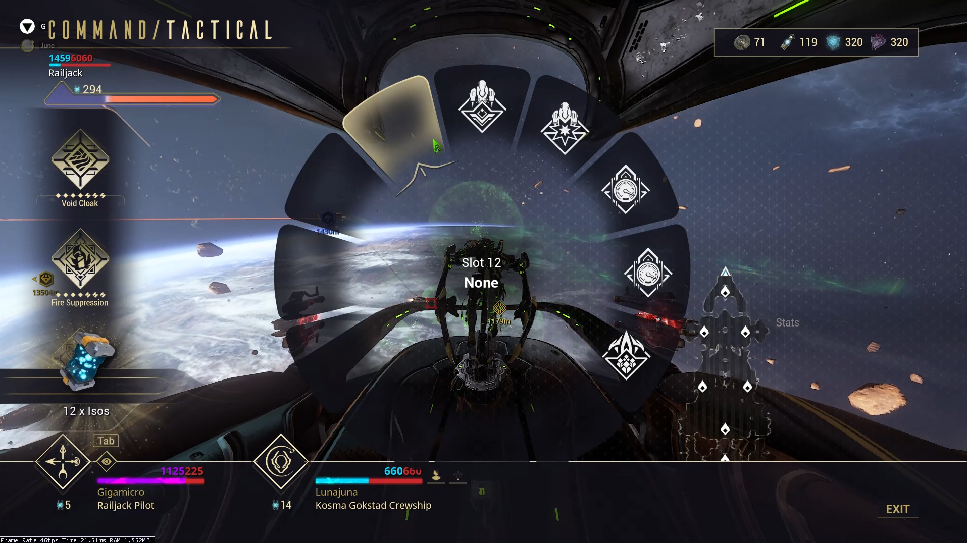 - Crew health, status, and Warframe abilities