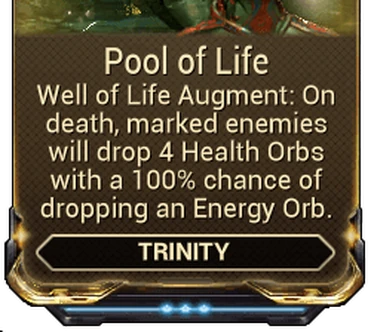 Champion's Blessing is a Warframe Augment Mod for TrinityIcon272 Trinity's Blessing130xWhite Blessing that increases their own primary and secondary Critical Chance based on the total percentage health healed, up to a +350% bonus.