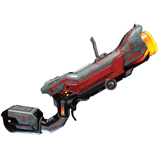 Tonkor grenade launcher, sporting increased critical chance, status chance, reserve ammo, reload speed, damage and a wider spread of damage types, as well as removing the minimum arming distance thus making the grenades explode on impact and even at closer ranges - which can stagger its wielder.
