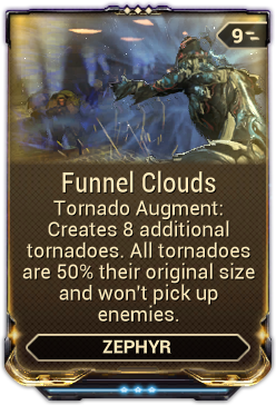 Funnel Clouds is a Warframe Augment Mod for Zephyr that increases the number of active Tornadoes while decreasing their size and removes their ability to pick up enemies.