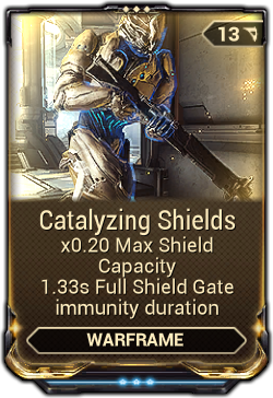 Catalyzing Shields is a mod for Warframes that sets the maximum Shield Gating duration upon fully recovering Shields, but reduces maximum Shield capacity.