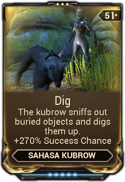 The Dig mod allows the Sahasa Kubrow to dig up items upon the battlefield. They will be able to dig up random ammunition types, health orbs, energy orbs, small amounts of credits, and occasionally mods.