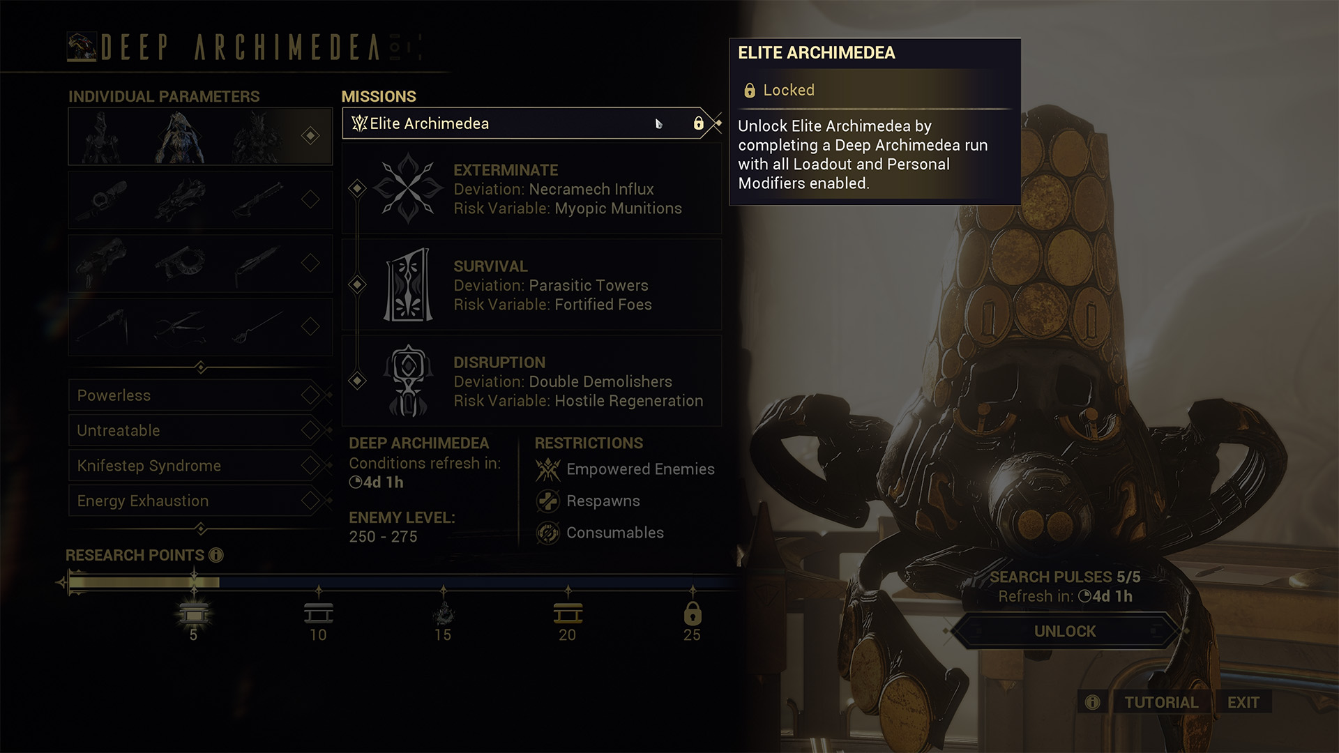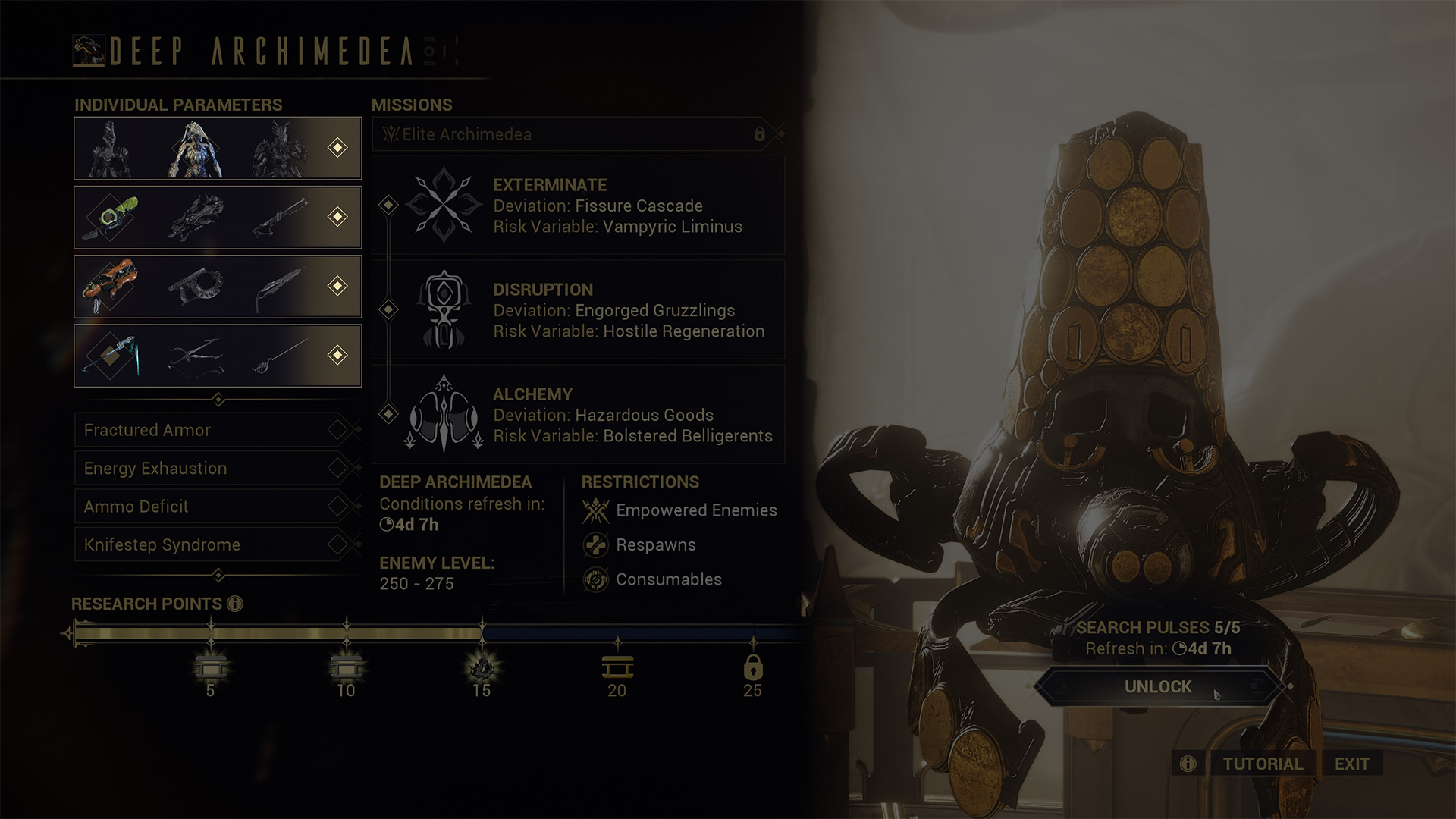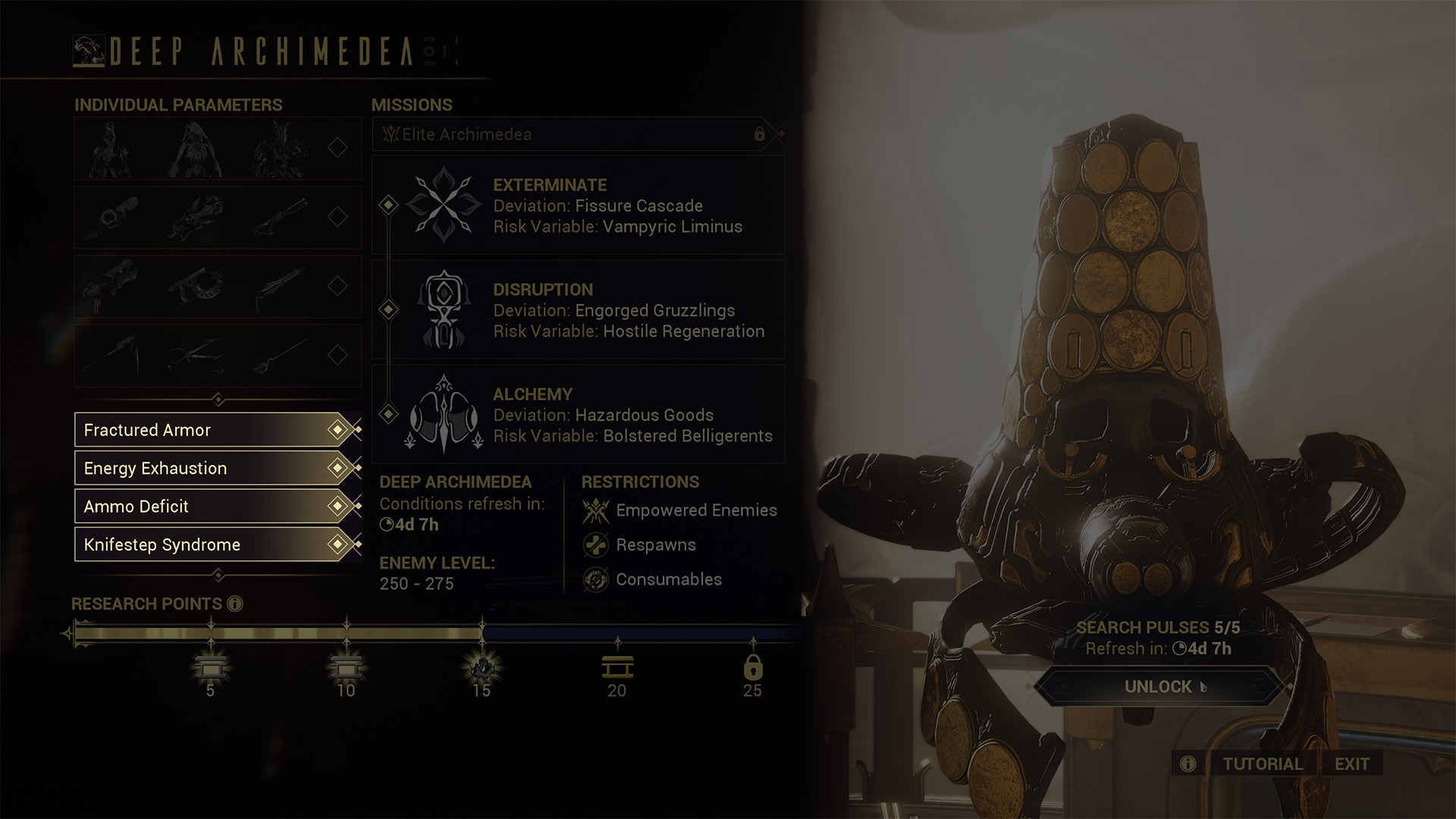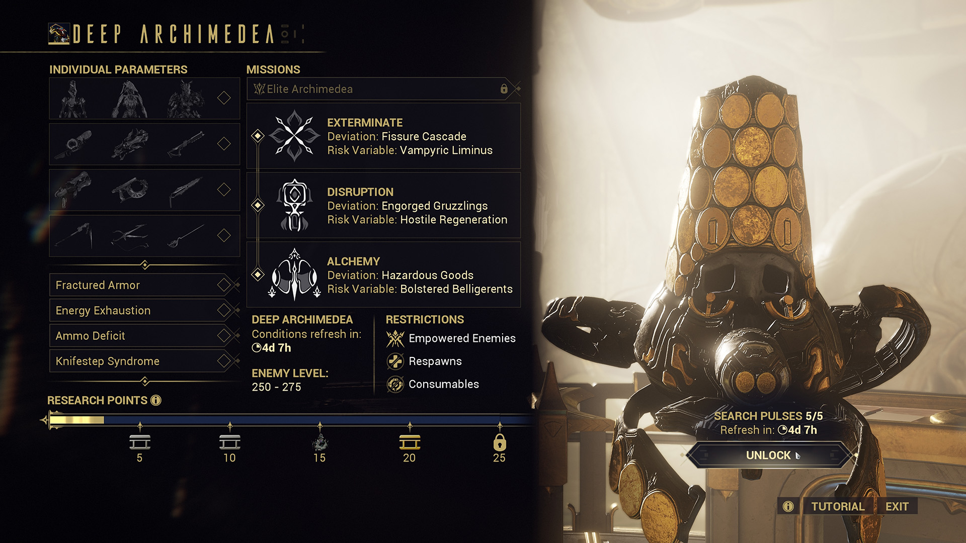 The last Hotfix unintentionally changed this week’s Deep Archimedea missions, modifiers, deviations and risk variables, so we’ve reverted it back to its previous state. It will properly refresh as scheduled on Monday at 0:00 UTC. You will not lose any Research Points in the revert.