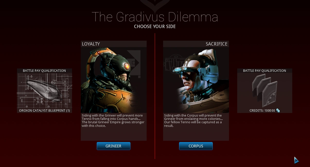 Intel shows a growing conflict that will begin on Gradivus in Mars. Expect it to spread. The Grineer are planning an operation against the Corpus lead by Sargas Ruk. Alad V of the Corpus has discovered a cache of Tenno in cryosleep and intends on exploiting them for his secret weapons project. The Grineer are outraged at this contract violation. They are using this as an excuse to invade Corpus space, enslave the local population, and grow their power. The Lotus is your guide but not your conscience. You will have to choose which side to support: Choose Loyalty, and side with the Grineer to destroy Corpus forces and free your kin. Choose Sacrifice, siding with Corpus to halt the Grineer conquest and enslavement of colonies.