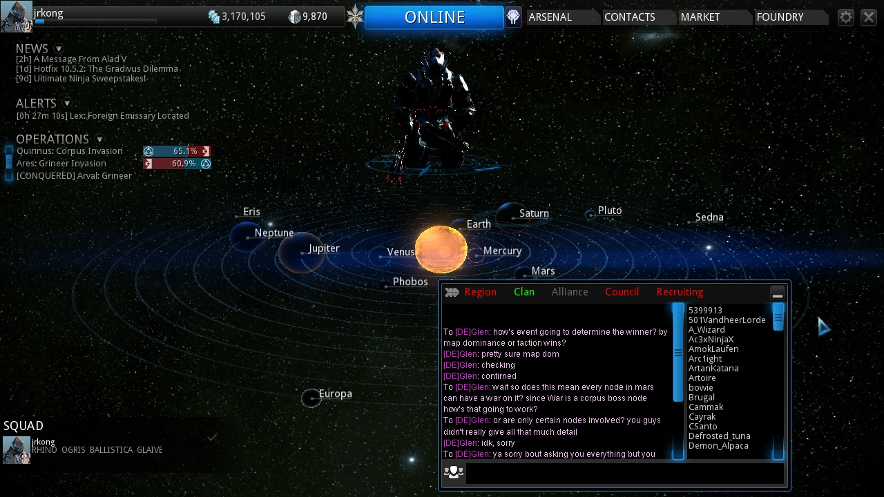 - Spear, Martialis, Augustus and Tharsis no longer count as of Hotfix 10.5.6 (2013-10-29) as a result of outside manipulation of the event results. After the battles on the mentioned nodes didn't progress in any way, DE suspected a bug/glitch in the event and investigated. They discovered the 'bug' was in fact caused by manipulation from a player, and removed the nodes from the results. It is currently unknown if the player(s) responsible for the 'hacking' have been found/banned. It is interesting to note that of the four nodes, three had been decided as Corpus victories.