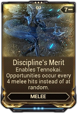 Discipline's Merit is a Exilus Weapon Mod for melee weapons that enables Tennokai opportunities to occur after a set number of hits instead of at random.
