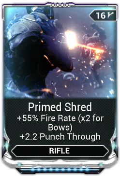 Primed Shred is the Primed version of Mod TT 20px Shred, which increases both fire rate of Primary weapons by 5% and punch through by 0.2 meter per rank for a maximum of 55% and 2.2 meter at Rank 10, respectively.