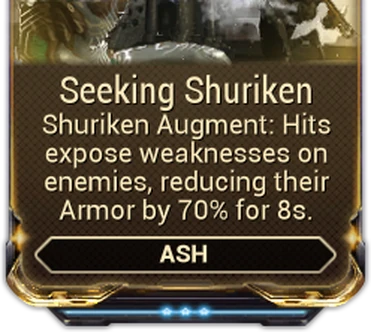Smoke Shadow is a Warframe Augment Mod for AshIcon272 Ash's SmokeScreen130xWhite Smoke Screen that allows AshIcon272 Ash to temporarily cloak nearby allies along with himself, while also increasing everyone's critical chance.