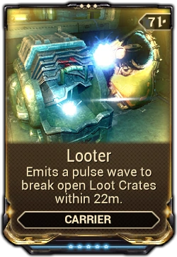 Looter is a mod that allows the Carrier (and its Prime counterpart) to break nearby containers by releasing a wave of energy that destroys all breakable Storage Containers within 12 meters at max rank.