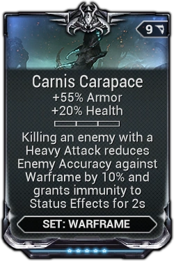 Carnis Carapace is a set mod that increases the armor and health of a Warframe.