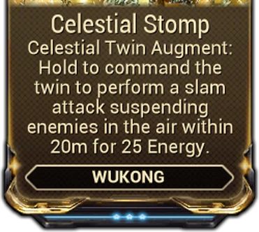 Celestial Twin, the twin becomes invulnerable to damage and receives its health restore per meter travelled bonus. After Cloud Walker ends, Wukong's twin is teleported to his side instantly. - Wukong cannot cast other abilities, perform parkour Maneuvers or general interactions while channeling this ability.