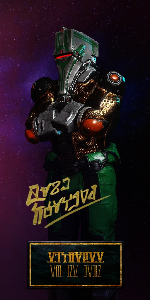 - He wears the Vexillus Cloak Syandana.