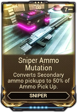 Sniper Ammo Mutation is a sniper rifle mod that converts any unused Secondary Ammo into Primary Ammo. The affected weapon will only convert ammo while equipped, and will not convert any ammo type used by holstered secondary weapons until their own ammo is full.