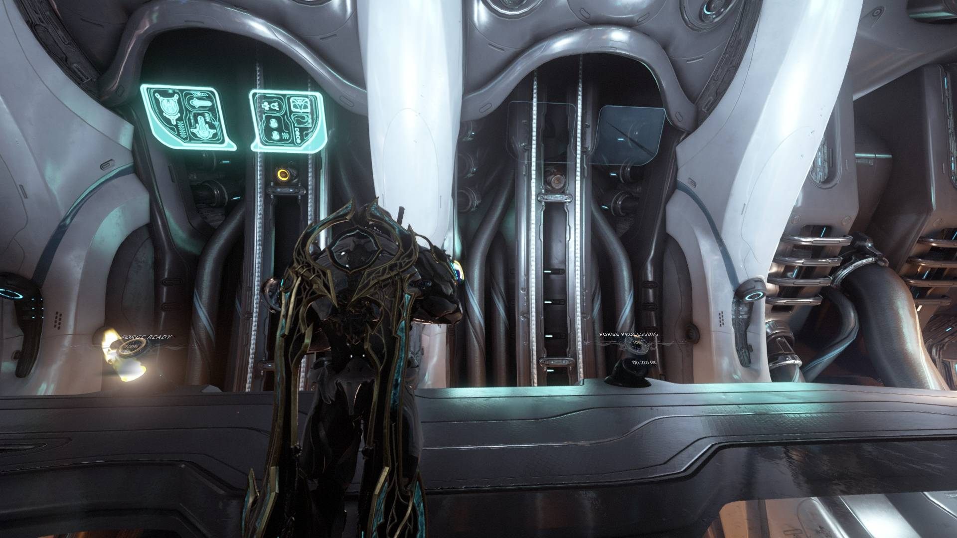 Certain Railjack components consume Railjack-specific resources. The Resource Forge can replenish these resources with materials obtained during the mission, using the four stations located at the back of the Railjack. Only one resource can be forged per terminal, which is created immediately upon activation before the station enters a cooldown of 3 minutes. Railjack resources will be instantly refilled for all squad members on crafting at the Forge, as well as adding additional capacity (Except for Warframe Energy). This additional capacity will last until ending the Railjack session by leaving the Dry Dock or returning to the Orbiter.