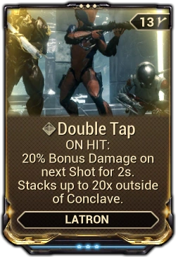 - Double Tap (Latron): On Hit: 20% Bonus Damage on next Hit for 2s. Stacks up to 20x outside of Conclave.