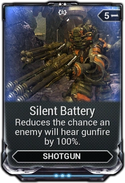 Silent Battery is a Mod that reduces Noise Level on Shotguns. At max rank, it renders any Shotgun completely silent and undetectable while firing.