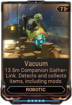 Vacuum is a Robotic mod that pulls in Pickups, Ammo, and Mods toward the Warframe from farther away.