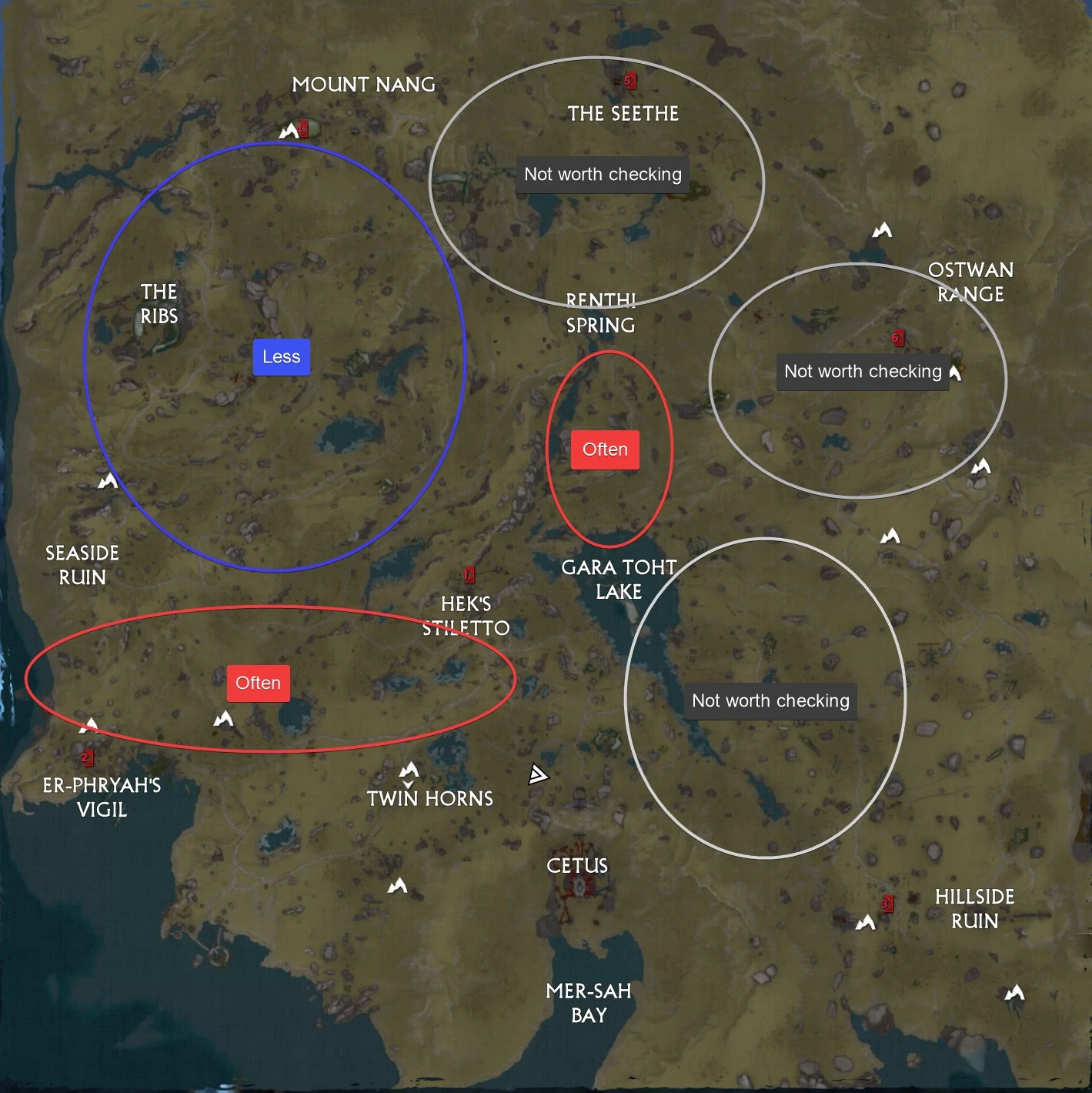 Guard Mode deals massive damage to the Tusk Thumper. - The following is a strategy the player can take to find and take down a Thumper quickly (see the above image for a visual aid for routing). At any point, if you see and/or hear the Tusk Thumper emerge from the ground, immediately engage, and, once the Thumper is destroyed, return to Cetus to start over. When entering the Plains from Cetus, fly towards Gara Toht Lake and then once you pass it make a large u-turn and head back towards the south side of the map. Travel westward in a zigzag pattern until you reach the shore, then fly north past the Seaside Ruin and beyond The Ribs until you reach the northwest corner of the map. Then, from there, fly once again in a zigzag pattern eastward past Mount Nang and stopping near Renthi Spring. Then, fly around the rest of Gara Toht lake until you land back at the entrance to Cetus. If you didn't see a Thumper, exit and try again. The red circle around the base at Mount Nang denotes an area that is slightly higher level than the areas surrounding it, meaning almost anywhere else along this route a Thumper may spawn, but in that area a higher tier Thumper would spawn instead (e.g.: a Thumper Bull may spawn on the route, but, at Mount Nang, a Thumper Doma would spawn instead).
