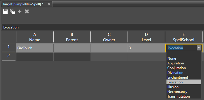 The SpellSchool field is a dropdown of spell schools.