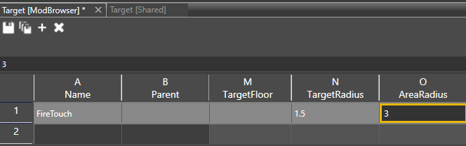 Return to your mod's Target file and Ctrl+V paste the copied spell animation into FireTouch’s Spell Animation column. Your Spell Animation column should now look like this.