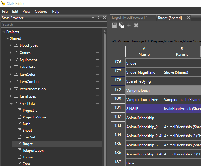 Let’s grab an existing animation and use it. In the Stats Editor, unfold the Shared section on the left, then unfold the SpellData inside it.