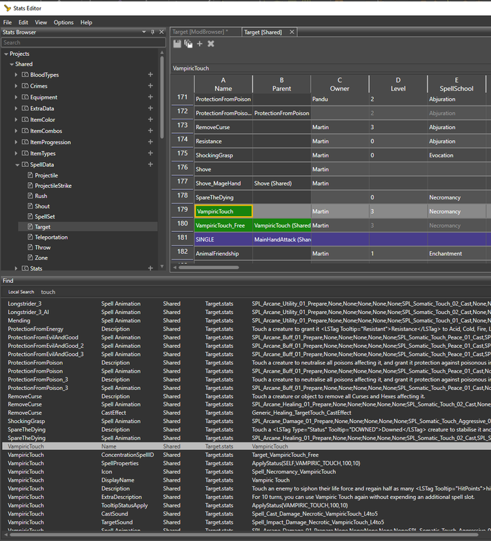 You should see the area below the search bar update with the results, showing you all the spells in the Shared Target file that have the word Touch in their name.