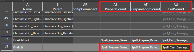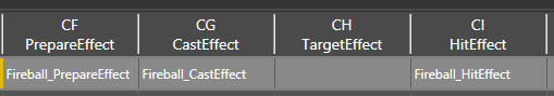 These effects are how we apply visuals onto our spells. All of these columns are dropdowns that show all the existing effects available in game.