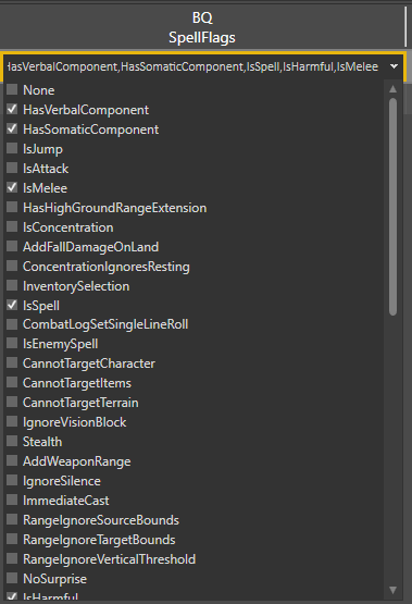 Spell flags are used to give additional information on how the spell is expected to behave. These can vary from case to case. The dropdown in this field allows multiple options to be selected.