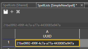 Copy UUID field from the Shared SpellLists table and paste it into your mod’s SpellLists: