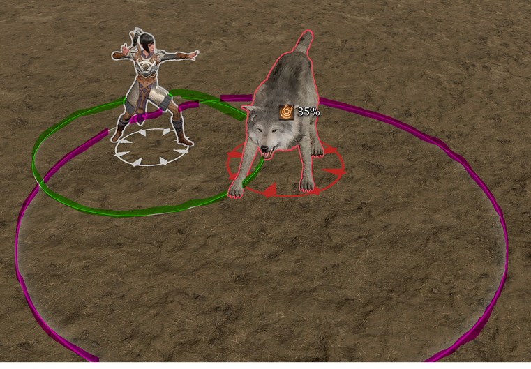When casting the spell, there are two circles present on the ground. The smaller circle (highlighted green in screenshot below) is our TargetRadius of 1.5, and the larger circle (highlighted magenta) is our AreaRadius.