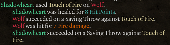 In this example, Shadowheart was the caster of the spell against a wolf. In the combat log, you can double-check the values of the spell: our wolf enemy was dealt 7 fire damage (3d10/2) and Shadowheart was healed (3d10/2) because they both passed their saves.