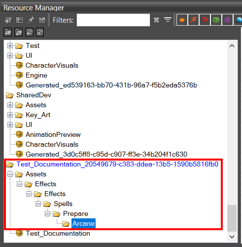 Navigate to the folder of your mod where you want your resource to reside. You will find your own mod at the bottom of the list of folders in the Resource Manager. In this tutorial, our mod is called Test_Documentation, so the folder that was created by default has the same name and is where our files will be placed.