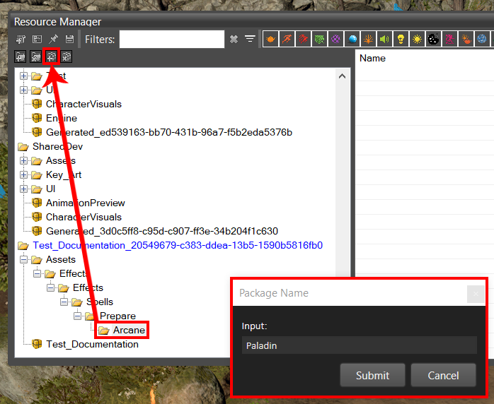 Folders can’t contain directly resources. For this, we need to create Packages. Select the Arcane folder, create a new package with the 3rd button from the top-left, and name it Paladin.