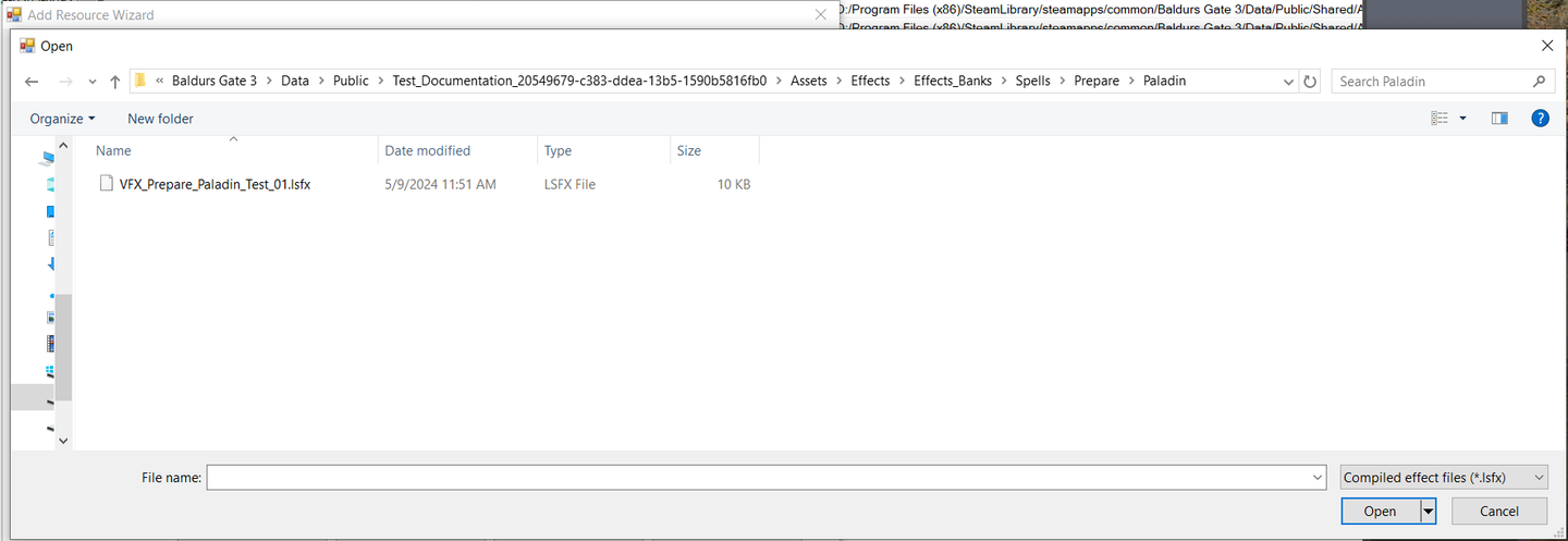 Navigate through the folder and locate the effect VFX_Prepare_Paladin_Test_01 created in Part 1. Select it and press Open.