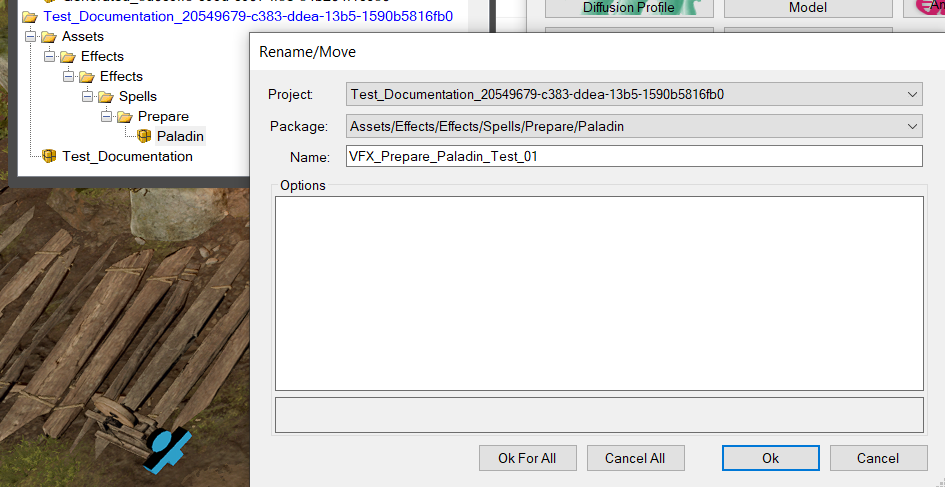 A new window named Rename/Move will then open. Since we selected the package Paladin before clicking on the Add Resource button, the Project (which means your mod) and Package should be correspond correctly. If they do not, manually select them. The name of the resource will be, by default, the same as the name of your effect. The name of your resource should always correspond to the name of your effect file. It is better not to change it.