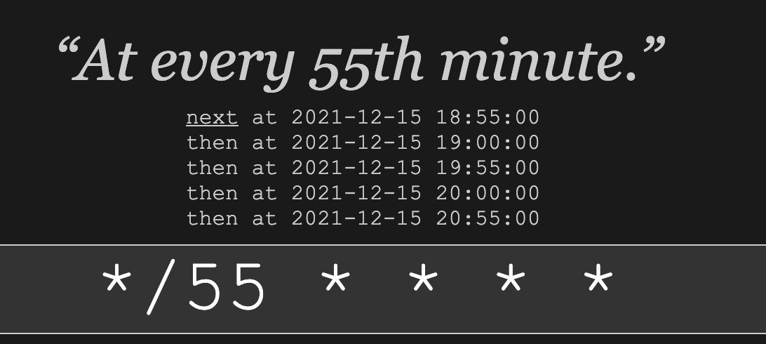 I'm running into a situation where a cron job I thought was running every 55 minutes is actually running at 55 minutes after the hour and at the top of the hour. Actually, it's not a cron job, but it's a PHP scheduling application that uses cron syntax.