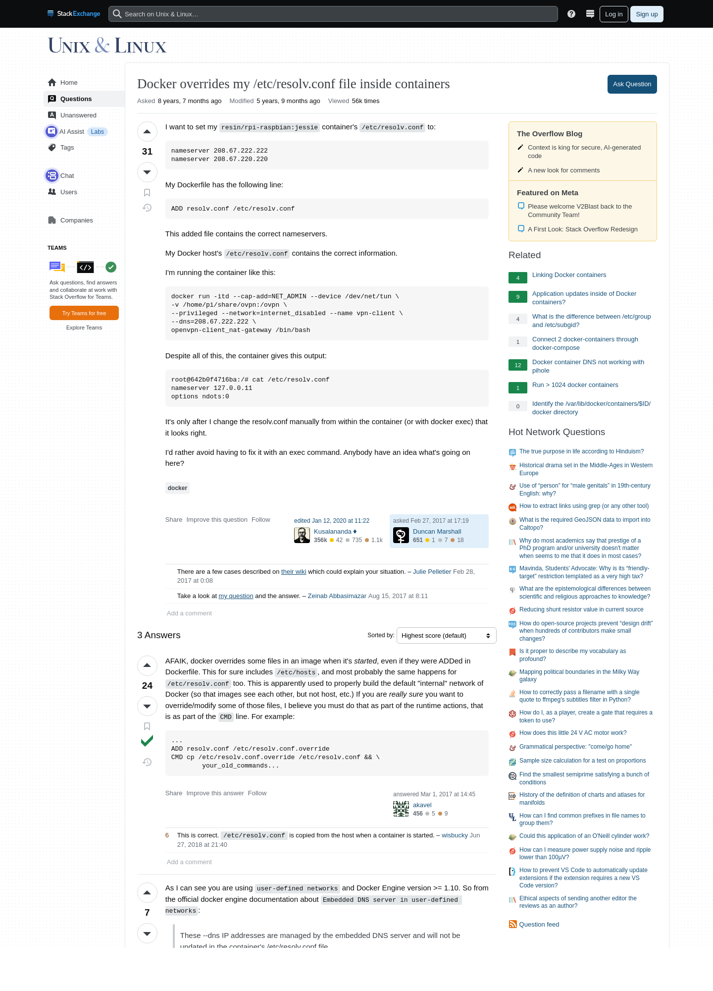 2025-10-08 4:08PM Docker overrides my /etc/resolv.conf file inside containers - Unix & Linux Stack Exchange ❢  πŸ“„  πŸ’»  πŸ…·  πŸ††  πŸ“¦  πŸ†  πŸ…Ό  πŸ…Ά  πŸ“Ό  πŸ›   9 https://unix.stackexchange.com/questions/347939/docker-overrides-my-etc-resolv-conf-file-inside-containers