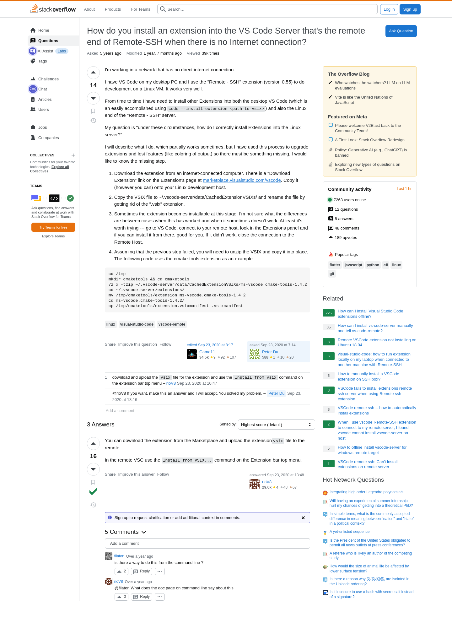 2025-10-12 11:31AM linux - How do you install an extension into the VS Code Server that's the remote end of Remote-SSH when there is no Internet c… ❢  πŸ“„  πŸ’»  πŸ…·  πŸ††  πŸ“¦  πŸ†  πŸ…Ό  πŸ…Ά  πŸ“Ό  πŸ›   9 https://stackoverflow.com/questions/64022855/how-do-you-install-an-extension-into-the-vs-code-server-thats-the-remote-end-of