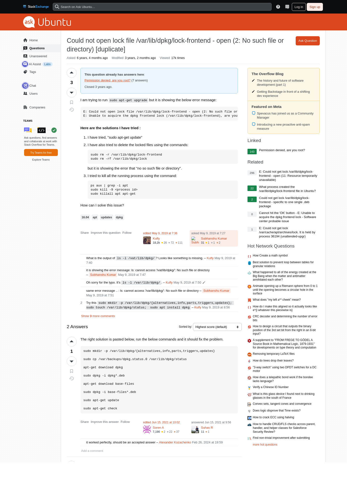 16.04 - Could not open lock file /var/lib/dpkg/lock-frontend - open (2: No such file or directory) - Ask Ubuntu